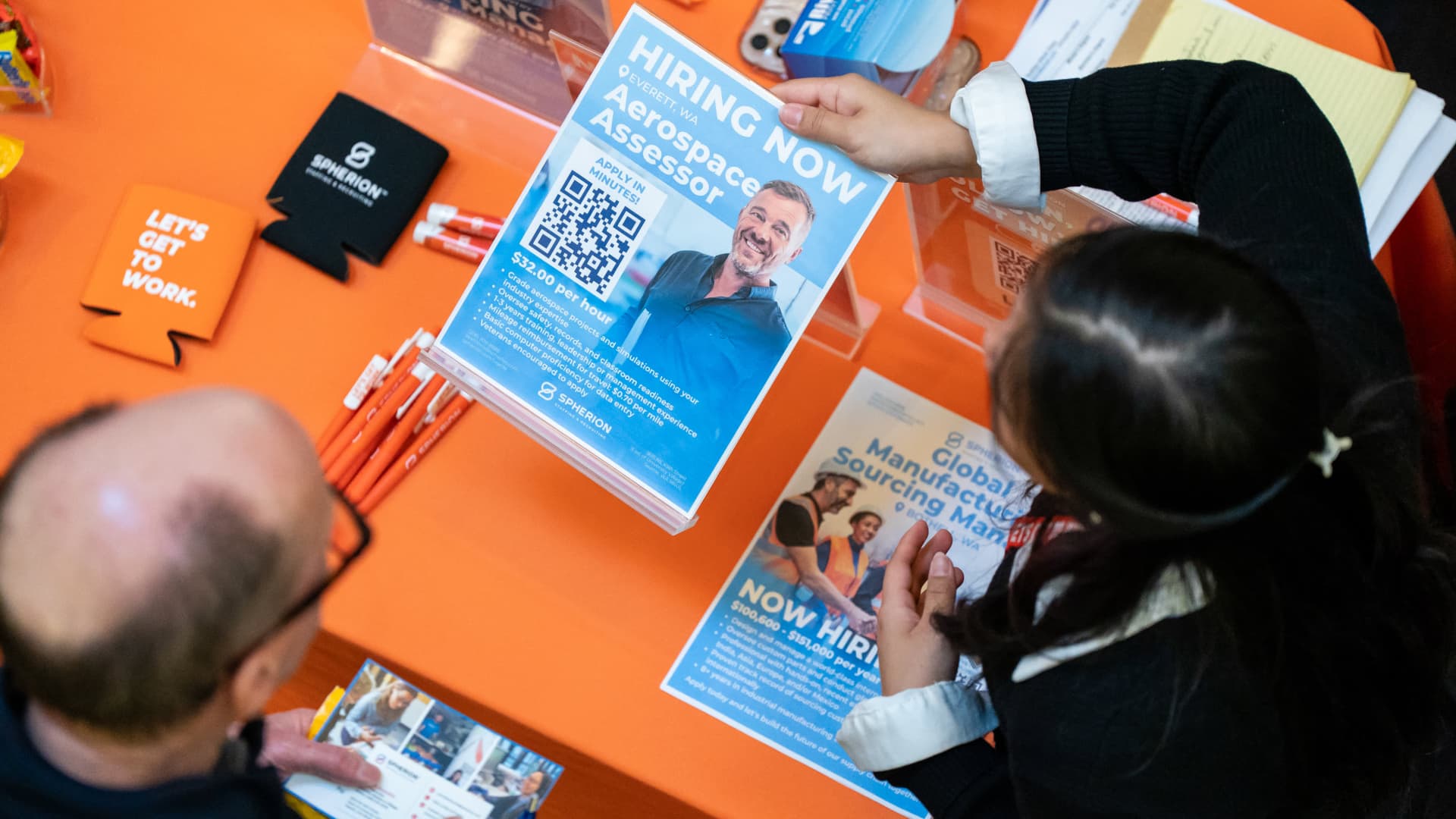A recruiter displays information while speaking to a jobseeker during the WorkSource North Seattle Career Fair in Seattle, Washington, US, on Tuesday, Feb. 10, 2026.